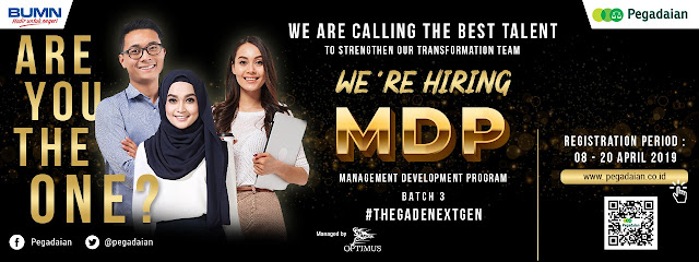 Lokernas.com - Informasi lowongan pekerjaan kali ini berasal dari PT Pegadaian (Persero). Melalui website resminya, Pegadian membuka lowongan atau rekrutmen terbaru untuk posisi Management Development Program (MDP) Batch 3. Lowongan ini terbuka untuk seluruh wilayah di Indonesia. Latar belakang pendidikan minimal untuk melamar lowongan ini adalah Sarjana atau S1. Lantas apa saja persyaratan yang dibutuhkan ? Ada beberapa point penting yang perlu digaris bawahi. Pertama adalah usia pelamar untuk lulusan Sarjana maksimal 25 tahun per 20 April 2019. Kemudian usia maksimal untuk lulusan Pascasarjana (S2) adalah 28 tahun per 20 April 2019. Selain itu IPK minimal 3.00 untuk lulusan Sarjana dan 3.25 untuk lulusan Pascasarjana (S2). Sedikit menyinggung mengenai profil singkat dari Pegadaian. Pegadaian tentu sudah banyak orang tahu adalah salah satu BUMN yang bergerak di bidang jasa agen inklusi jasa keuangan di Indonesia. Pegadaian memiliki nilai-nilai perusahaan yang terus diemban sampai saat ini meliputi Integrity, Professional, Mutual Trust, Customer Focus, dan Social Value. Untuk info lebih lanjut, ada baiknya Anda simak pengumumannya di bawah ini. Tidak heran sebagai perusahaan besar, Pegadian telah mendapat beberapa penghargaan. Sebut saja pada tahun 2018 yang lalu Pegadaian mendapat penghargaan sebagai BUMN terbaik Kategori bidang Keuangan Sektor Pembiayaan dan Keuangan Lainnya oleh Majalah Investor. Kemudian TOP CSR 2018-Program Integrasi produk dengan inisiatif CSR oleh TopBusiness. Dan masih banyak penghargaan lainnya. Hal ini membuktikan bahwa Pegadaian mampu bertransformasi sebagai BUMN yang menjadi pilihan banyak masyarakat.