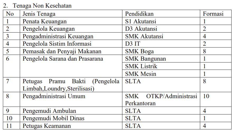 Adapun formasi yang dibuka terdiri dari 2 jenis tenaga. Pertama tenaga kesehatan terdiri dari 11 formasi diantaranya Dokter Umum, Perawat Ners, Perawat Vokasi, Bidan, Ahli Tekhnologi Laboratorium Medis, Radiografer, Nutrisionis, Perekam Medis, Penyuluh Kesehatan Masyarakat, dan Tenaga Teknis Transfusi Darah. Sedangkan untuk formasi kedua adalah tenaga non kesehatan yang terdiri dari Penata Keuangan, Pengelola Keuangan, Pengadministrasi Keuangan, Pengelola Sistem Informasi, Pemasak dan Penyaji Makanan, Pengelola Sarana dan Prasarana, Petugas Pramu Bakti, Pengelola Limbah, Loundry, Sterilisasi), Pengadministrasi Umum , Pengemudi Ambulan, Pengemudi Mobil Dinas, dan Petugas Kemanan.